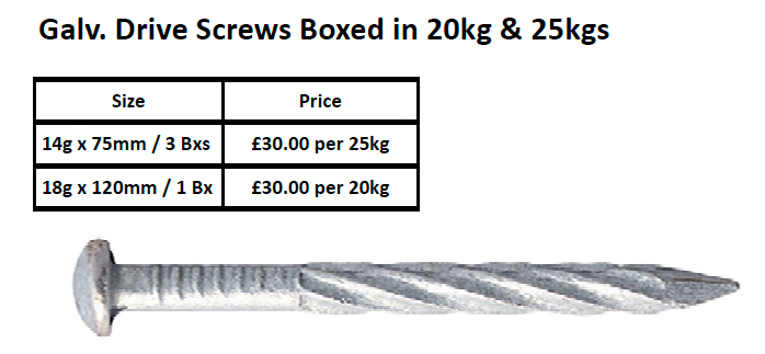 GALV. DRIVE SCREWS BOXED IN 20KG & 25KGS